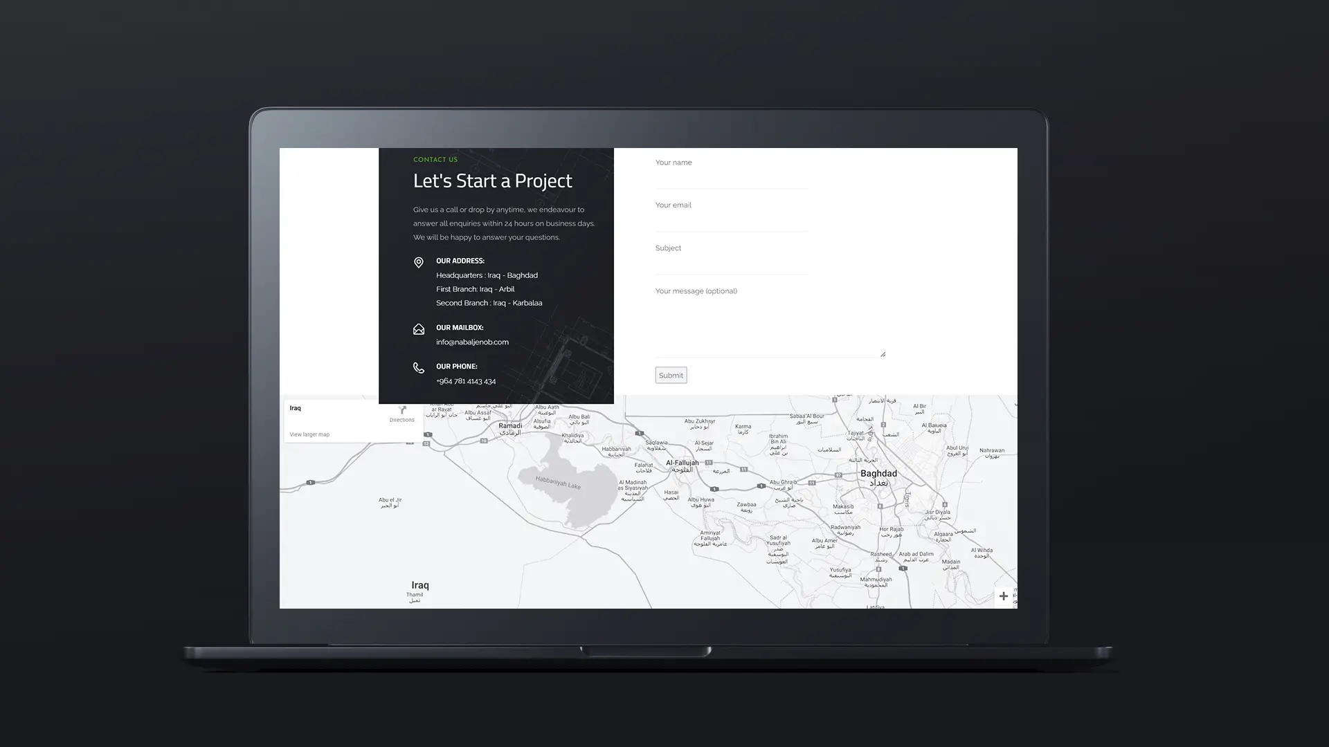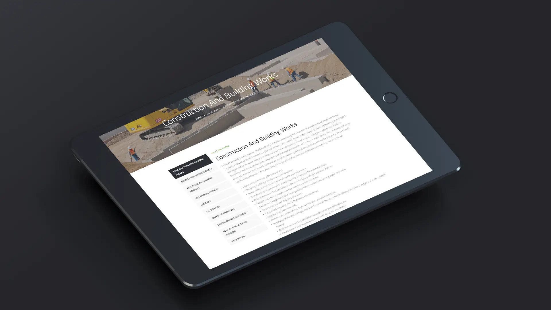 Naba Aljanob General Trading & Contracting Co. LLC, a contracting company based in Iraq, approached THE MOOB to redesign their first website, which was incomplete and lacked essential information. We delivered a professional, fully responsive website that showcased their services, mission, and projects. A brand-new logo and attention to detail transformed their vision into a functional and aesthetically pleasing digital platform.